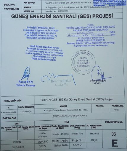 Kahramanmaraş ilinde kurulacak olan çatı uygulamalı 1 Mw GES proje hazırlama işi tarafımızdan yapılmıştır. Proje onayı Tedaş Proje ve Tesis daire Başkanlığından alınmıştır.